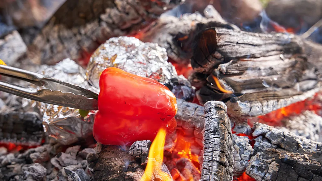 Rooster de paprika's boven het vuur, doe ze vervolgens in een kom, dek ze goed af en laat ze 10 minuten staan voordat je de schil eraf haalt.