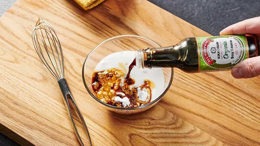 Meng de Kikkoman natuurlijk gebrouwen biologische sojasaus, kokosmelk en het maïszetmeel met 250 ml water.