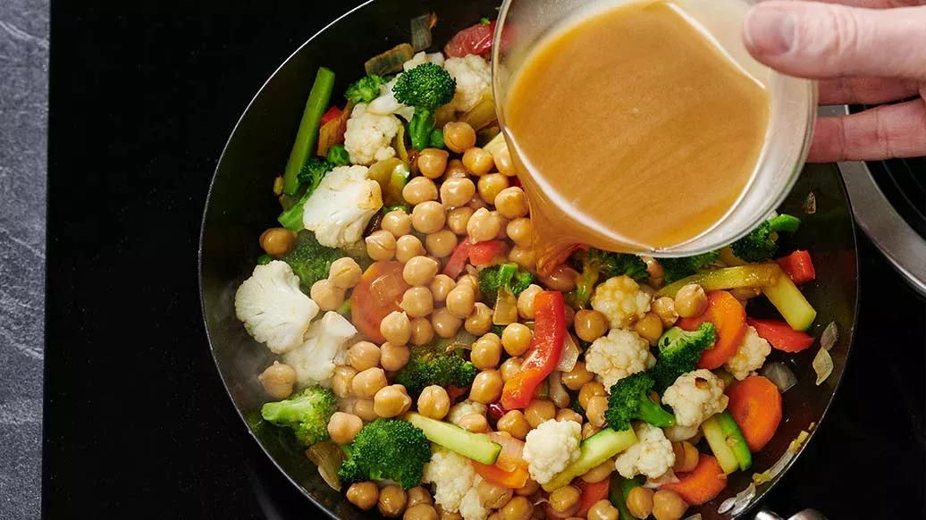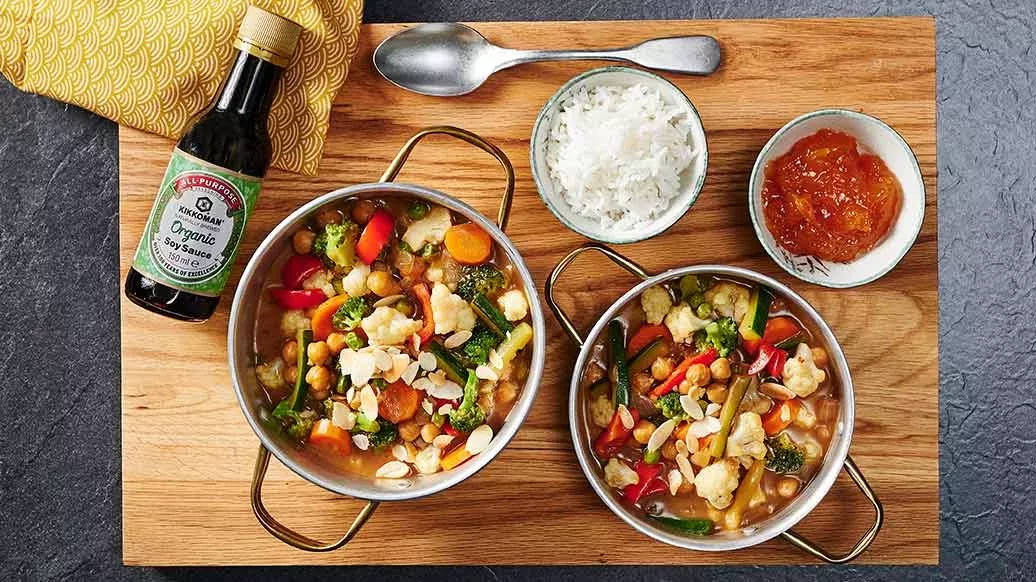 Verhit de olie in een wok of diepe frituurpan op middelhoog vuur. Voeg uien, gember en knoflook en een snufje currypoeder toe en al roerend een minuut lang laten smoren. Voeg de groenten toe en roerbak ze 4 minuten - of tot de groenten gaar zijn. Voeg de kekererwten en het mengsel van Kikkoman natuurlijk gebrouwen biologische sojasaus, kokosmelk en maïszetmeel toe en breng het aan de kook. Ca. 1 minuut en al roerend laten koken totdat de kekererwten warm zijn.