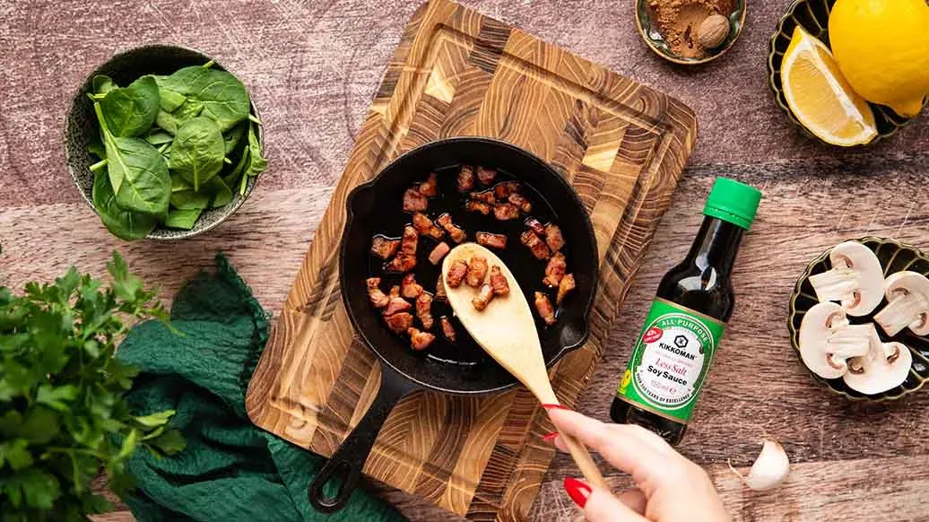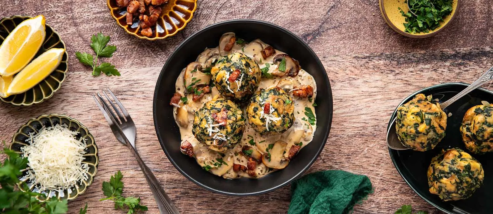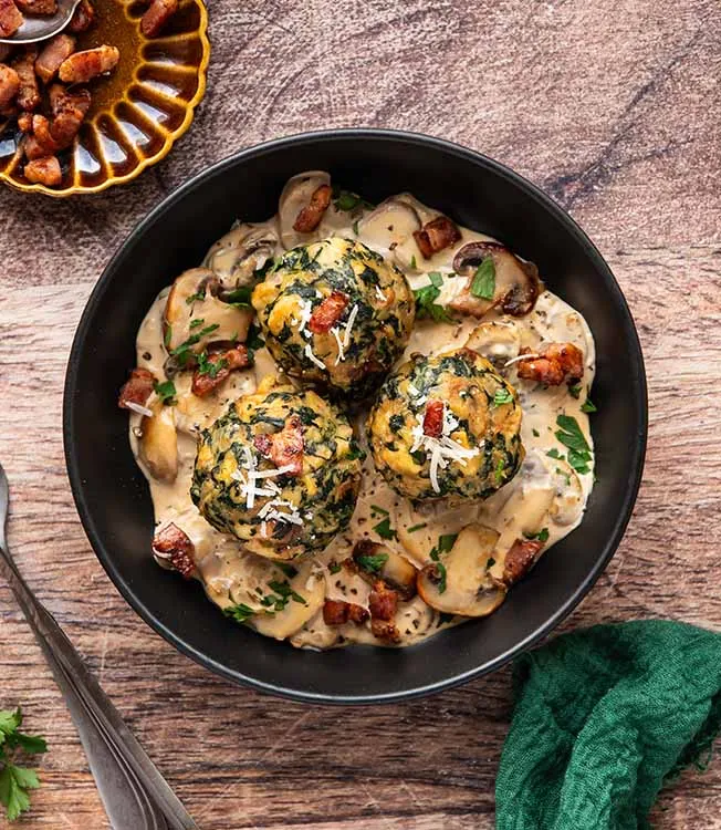 Lichte spinazie-brood-dumplings gemaakt van overgebleven broodjes, op smaak gebracht met Kikkoman Sojasaus Minder Zout en geserveerd met een romige champignonsaus en een beetje knapperig spek – een eenvoudig, hartverwarmend gerecht dat goed gebruikmaakt van brood van een dag oud.
