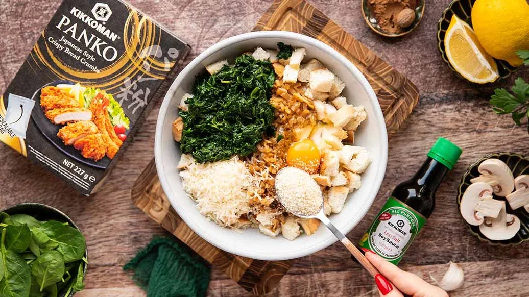 10 g boter – 180 g fijngehakte babyspinazie – 40 g fijngesneden ui – 60 ml melk – 1 ½ el Kikkoman Natuurlijk Gebrouwen Sojasaus Met Minder Zout – 0,33 tl versgemalen zwarte peper – ¼ tl nootmuskaat – 150 g oude broodjes, in blokjes gesneden – 15 g Grana Padano-kaas, geraspt – 1 ½ el Kikkoman Panko - Knapperig Paneermeel in Japanse Stijl – 1 ei