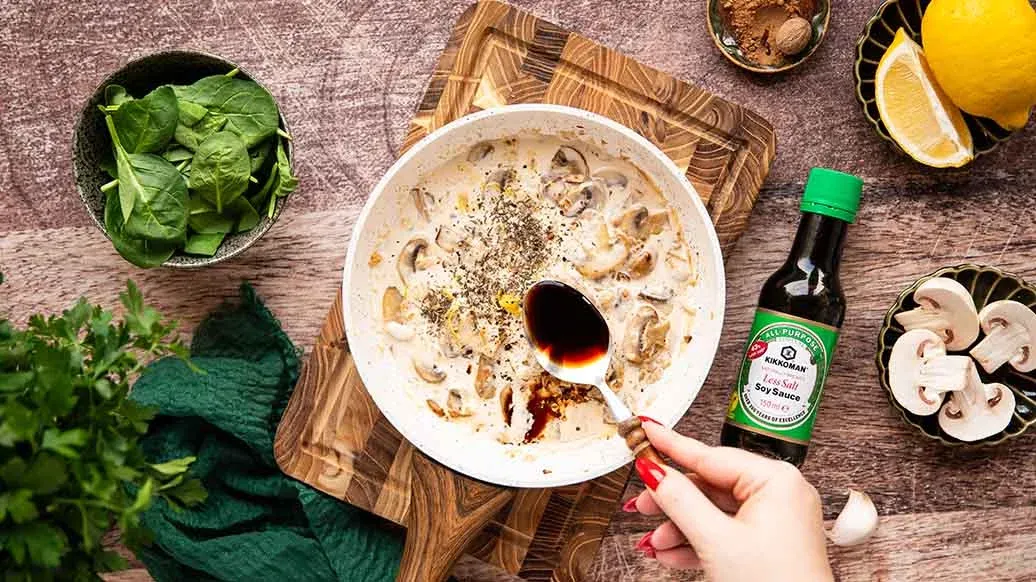 150 g champignons – 15 g boter – 60 g fijngesneden ui – 100 ml slagroom – 1 teentje knoflook, geperst – 1 ½ el Kikkoman Natuurlijk Gebrouwen Sojasaus Met Minder Zout – 0,33 tl gedroogde tijm – 0,33 tl versgemalen zwarte peper – 1 tl citroensap – ½ tl citroenschil
