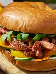 Rooster de sesamzaadjes en de pinda's droog in een pan en voeg het gerookte paprikapoeder toe. Meng het met de salade en giet er vlak voor het opdienen de dressing over.