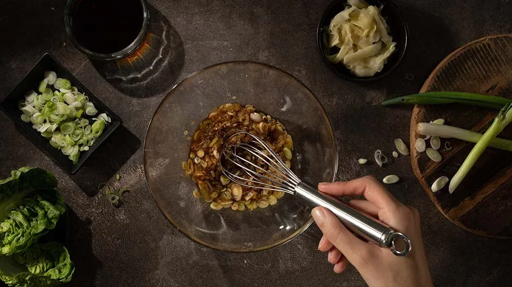 Was de sla, centrifugeer deze droog en verwijder eventuele dikke stengels. Snijd voor de dip de gember in reepjes en meng deze met de lente-uitjes en de Kikkoman Ponzu Yuzu.