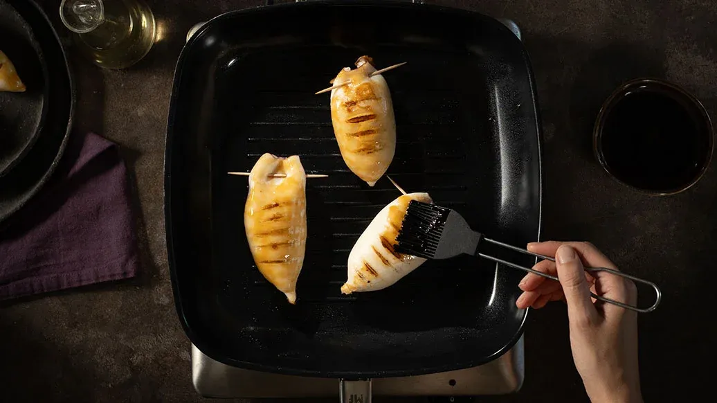 Grill de inktvis op middelhoog vuur op de barbecue of in een grillpan gedurende 10 minuten. Bestrijk vervolgens alles met de Kikkoman Teriyaki BBQ-saus Met Honing en draai regelmatig om – dit duurt nog eens 2 minuten.