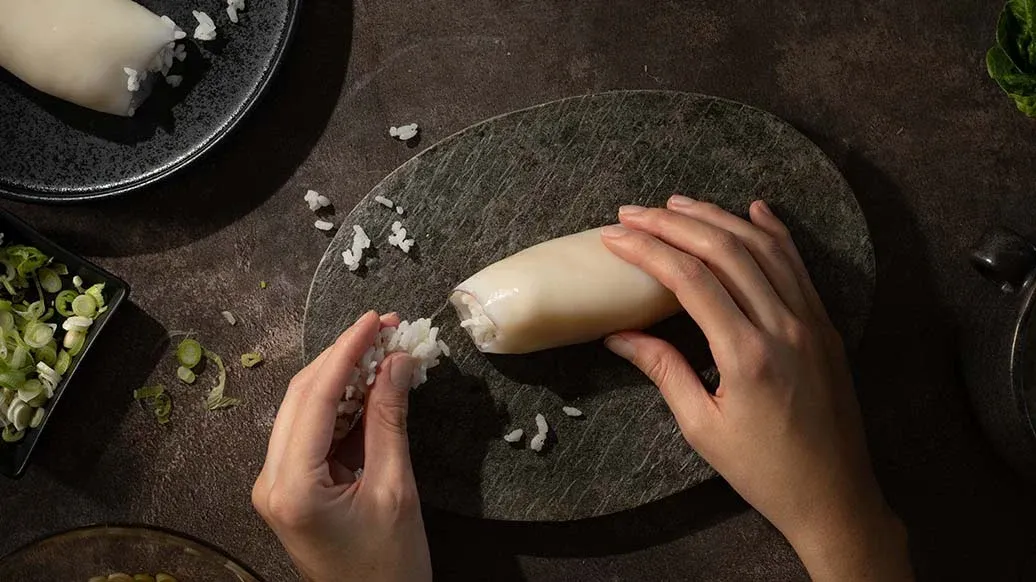 Spoel de inktvisbuizen af en laat ze uitlekken. Vul ze met de sushirijst, maar zorg ervoor dat u ze niet te vol doet. Sluit de open uiteinden af met de houten spiesen.