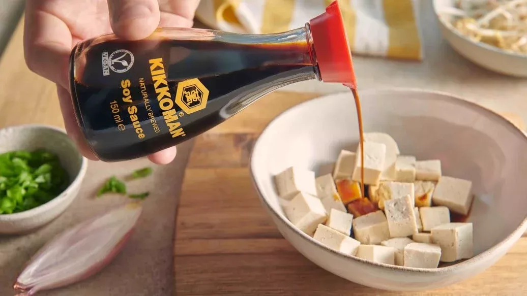 Snijd de tofu in blokjes, marineer deze in Kikkoman Sojasaus en zet ze 5 minuten apart. Smeer de tofublokjes vervolgens in met bloem en bak ze goudbruin. Leg ze op keukenpapier.