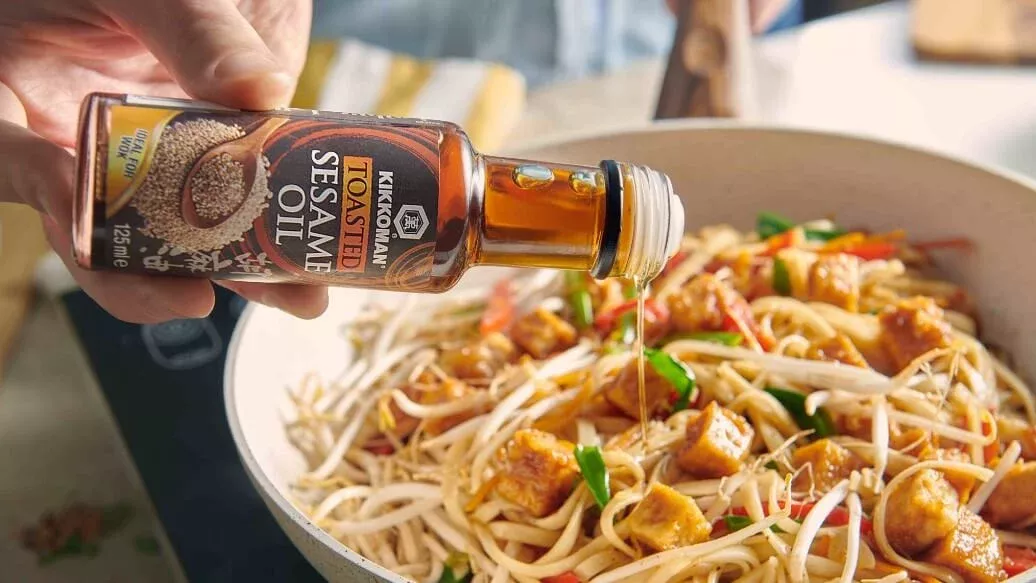 50 ml olie – 50 g mungbonen – ½ tl chilivlokken – 2 el groene lente-uitjes (fijngehakt) – 2 el Kikkoman Geroosterde Sesamolie