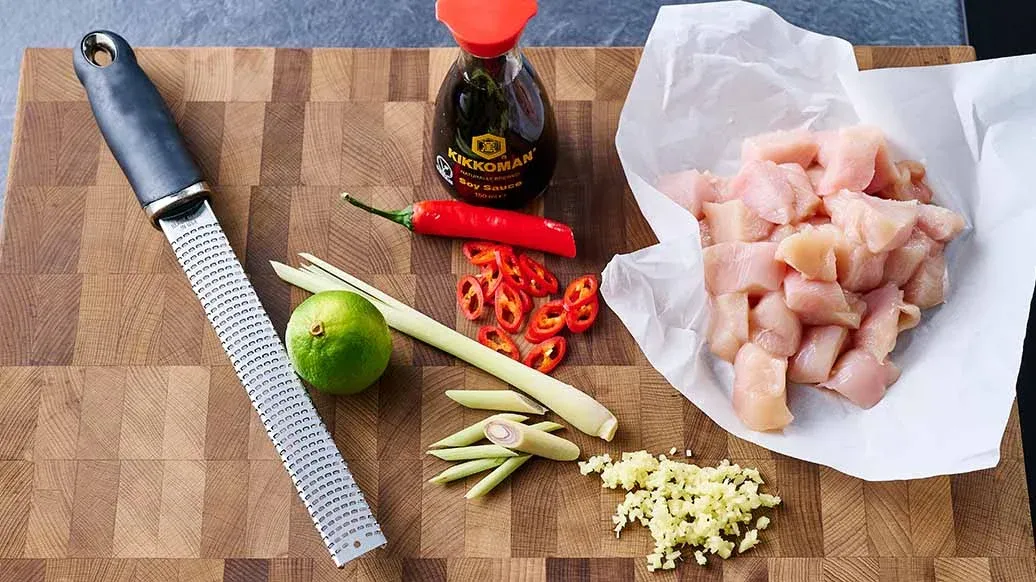 1 stokje citroengras – 1 klein stukje gember – 1 kleine onbehandelde limoen – 1 kleine rode chilipeper – 400 g kipfilet
