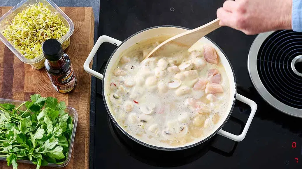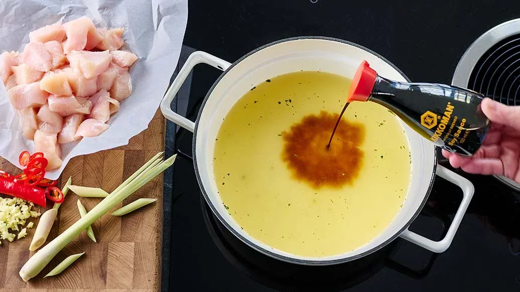 Breng de kippenbouillon aan de kook met de Kikkoman Sojasaus. Voeg het citroengras, de gember, een beetje limoenrasp en -sap, chilipeper, kokosmelk en suiker toe. Verwarm door.