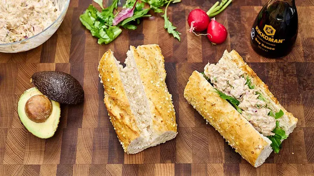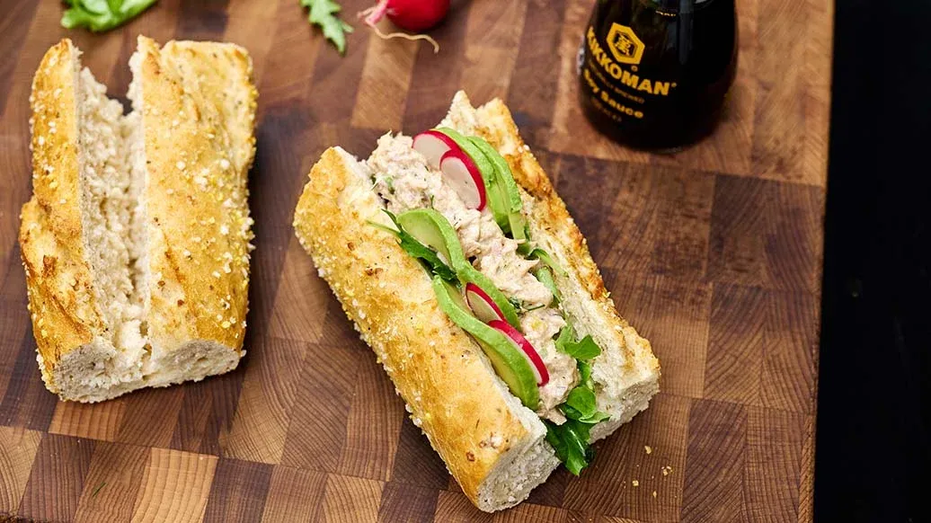 Hartig volkorenbrood belegd met romige tonijnsalade, knapperige sla en verse avocado, op smaak gebracht met Kikkoman Sojasaus en Griekse yoghurt. Voedzaam en boordevol groenten, met een smaakboost van een romige soja-wasabidressing voor een frisse Aziatische twist.