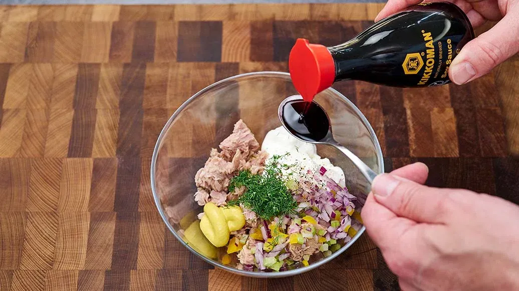 100 g uitgelekte tonijn (in water) – 80 g Griekse yoghurt – 40 g gele paprika, in blokjes – 1 tl rode ui, fijngehakt – 20 g bleekselderij, fijngehakt – ½ tl citroensap – 3 tl Kikkoman Natuurlijk Gebrouwen Sojasaus – 1 tl verse dille, fijngehakt – ½ tl scherpe mosterd – ¼ tl versgemalen peper