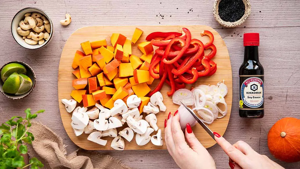 Snijd de pompoen in gelijkmatige blokjes (3x3 cm). Snijd de champignons in vieren of halveer ze als ze klein zijn. Snijd de rode paprika in reepjes. Schil de sjalotten en snijd ze in dunne partjes.