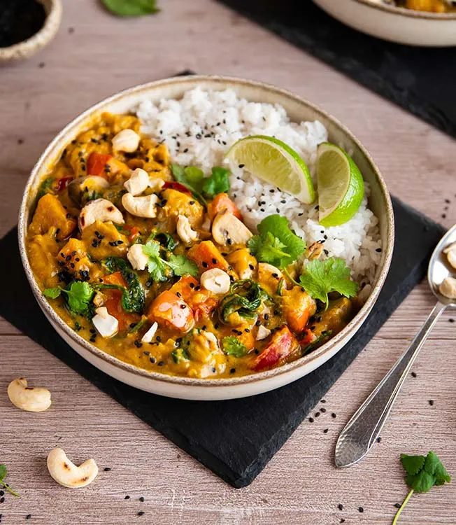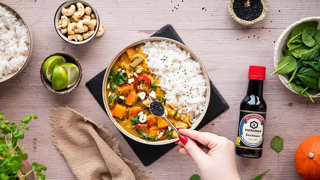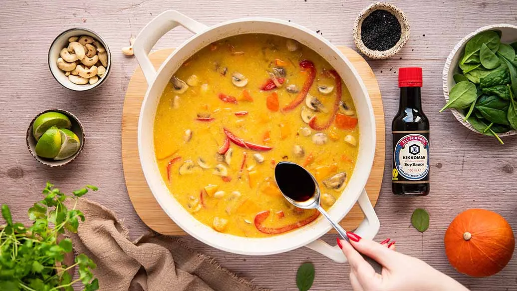 Een milde veganistische groene curry met pompoen, spinazie en champignons. Kokosmelk geeft het gerecht een rijke smaak, terwijl Kikkoman Sojasaus zorgt voor een diepe umami-smaak. Licht maar heerlijk en eenvoudig te bereiden.