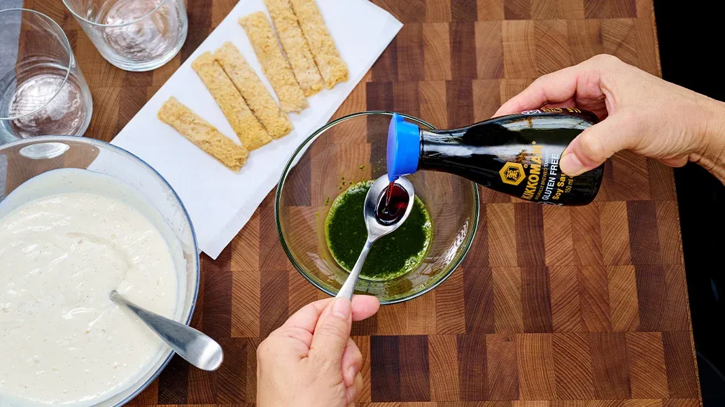 2 tl matchapoeder – 40 ml heet water – 3 tl Kikkoman Natuurlijk Gebrouwen Tamari Glutenvrije Sojasaus – 4 tl agavesiroop (of ahornsiroop of bruine suiker)