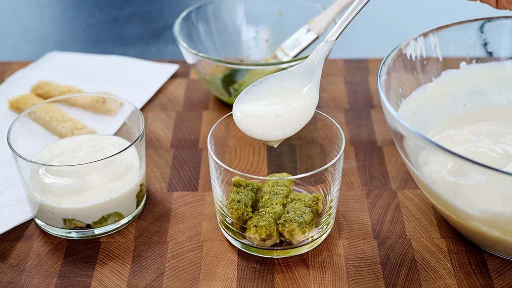 Snijd het biscuitgebak in reepjes van ongeveer 1,5 cm breed en leg de helft ervan in dessertglaasjes. Meng voor de siroop het matchapoeder met het hete water, de Kikkoman Glutenvrije Sojasaus en de agavesiroop.