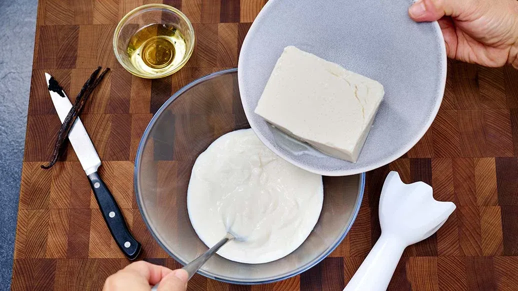 Snijd het vanillestokje in de lengte door en schraap de zaadjes eruit met een klein scherp mesje. Mix de zijden tofu met de sojayoghurt, agavesiroop en vanillezaadjes tot een glad mengsel.
