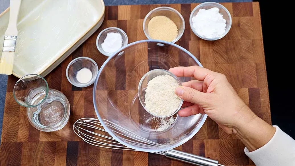 ½ tl veganistische boter om de pan in te vetten – 45 g amandelmeel – 75 g aardappelzetmeel of maïzena – 20 g bruine suiker – 3 tl bakpoeder – ½ tl agar-agar – 150 ml mineraalwater