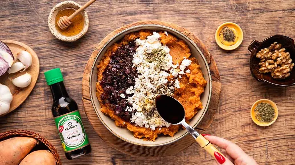 180 g rode ui – 3 el koolzaadolie – 2 tl honing – 3 el Kikkoman Natuurlijk Gebrouwen Sojasaus Met Minder Zout – 350 g gekookte en gepureerde zoete aardappelen – 100 g fetakaas, verkruimeld – 1 teentje knoflook, geperst – ½ tl versgemalen zwarte peper – ½ tl gedroogde marjolein – ½ tl gedroogde tijm