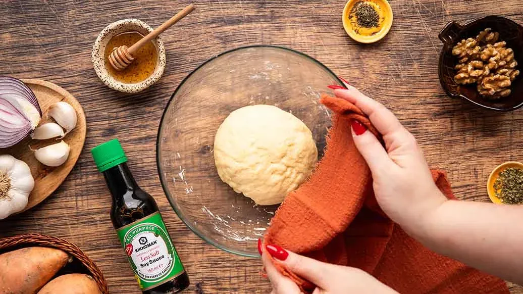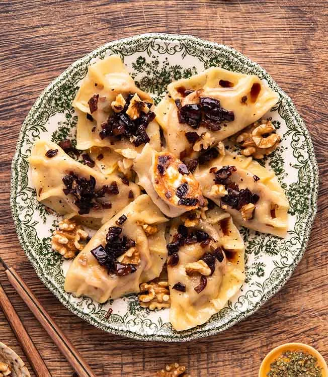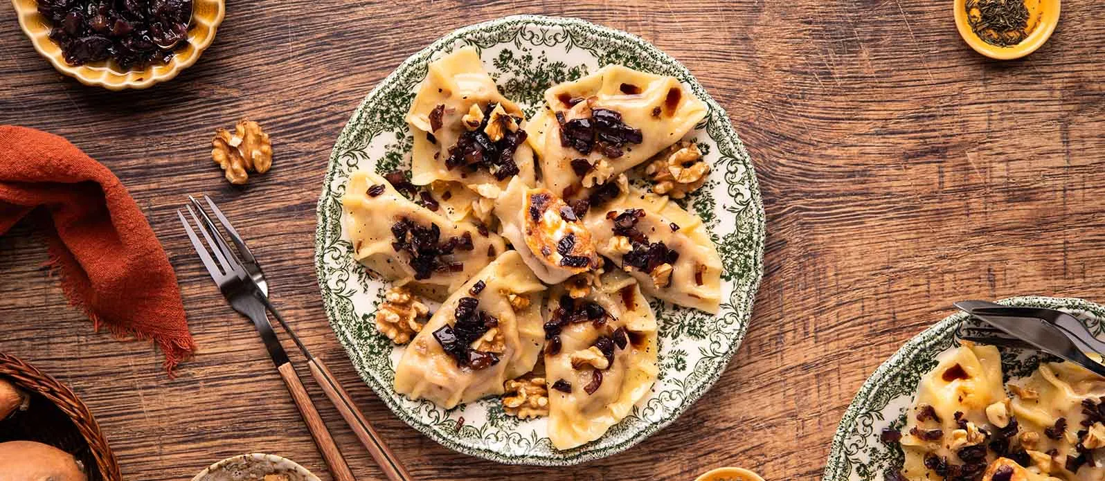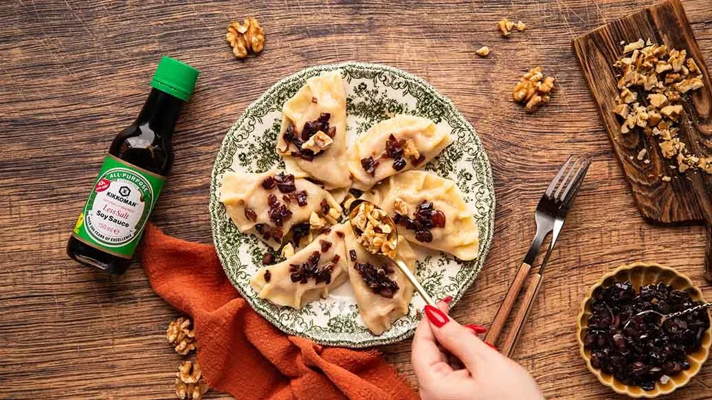Pierogi met een twist: Poolse dumplings gevuld met zoete aardappel, feta en gekarameliseerde ui. Een scheutje Kikkoman Sojasaus Minder Zout voegt een rijke umami-smaak toe, terwijl gehakte walnoten zorgen voor een lichte crunch en een zoet-hartige smaakbeleving.