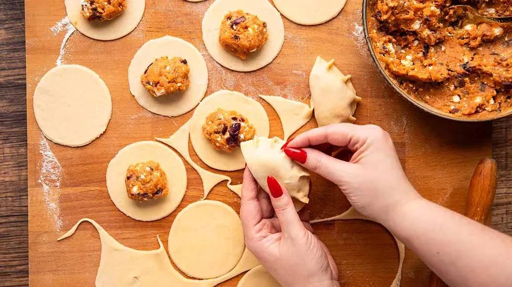 Rol het deeg uit en steek met een glas cirkels uit. Schep een lepel vulling in het midden, vouw het deeg dubbel tot een halve maan en druk de randen goed aan. Kook de dumplings 4 minuten in gezouten water nadat ze naar de oppervlakte zijn gekomen.