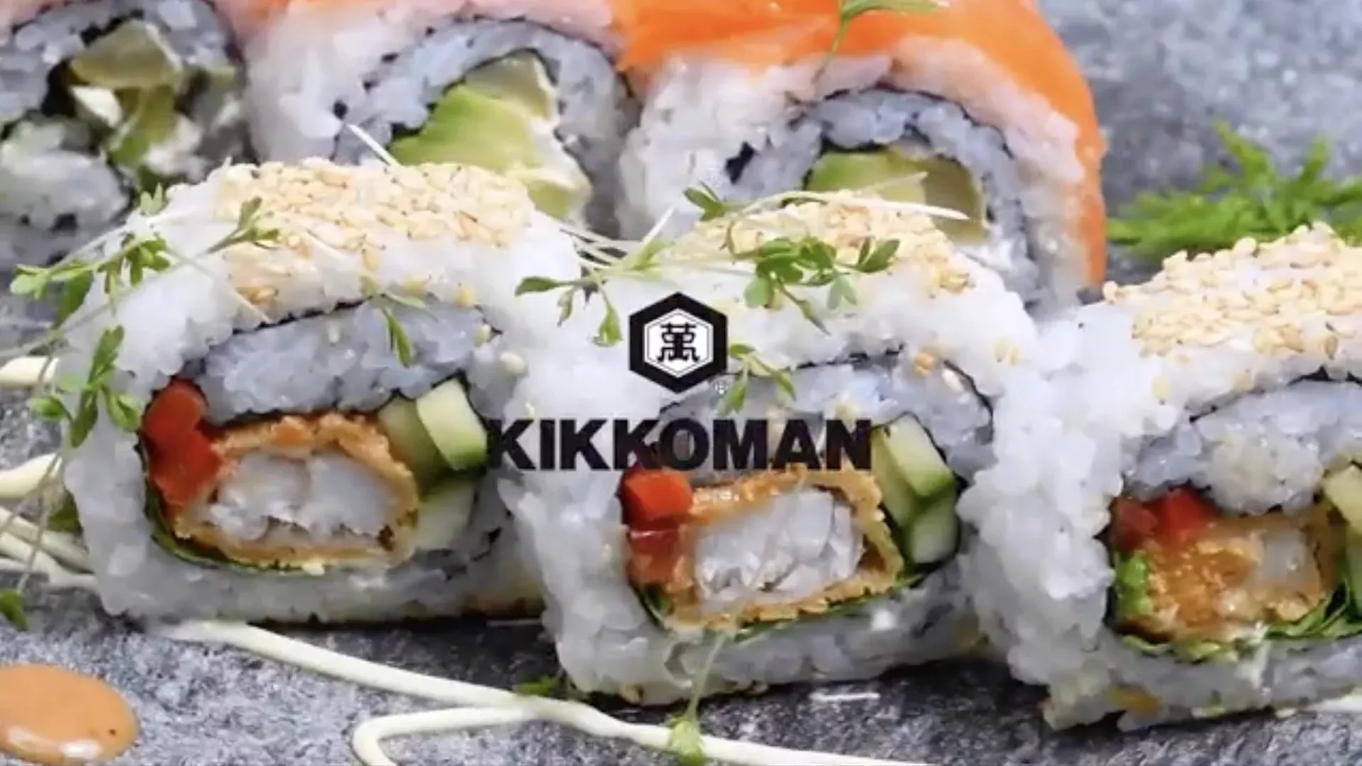 Maak de sushi af met tuinkers, mayonaise en Kikkoman Sesam dressing.