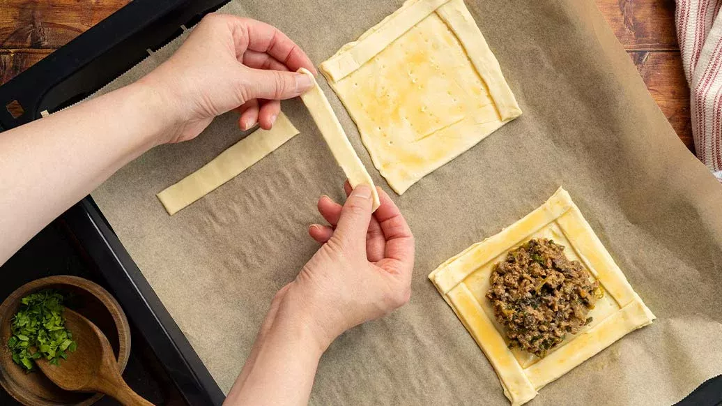 Smeer het bladerdeeg in met ei. Leg de vier repen op de randen. Leg de vulling die u in stap 1 heeft gemaakt in het midden en smeer de randen nog een keer in met het ei.