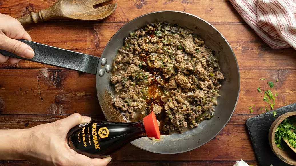 Snijd de uien en champignons fijn. Giet de Kikkoman Sesamolie in een pan en bak de champignons en lente-ui zodra de pan warm is. Als ze zacht zijn, voeg het rundergehakt toe.