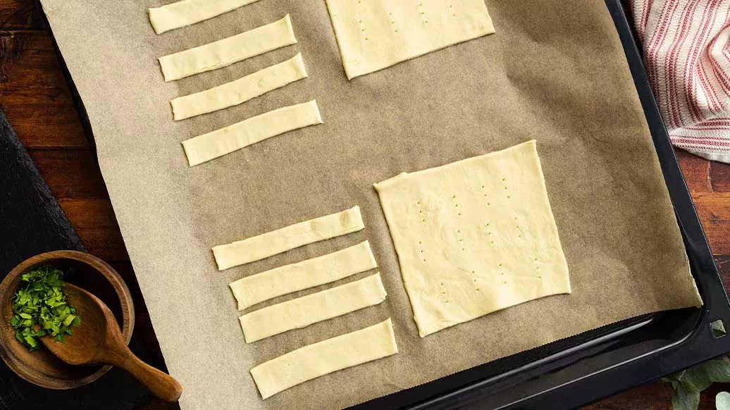 Snijd 8 vierkanten uit het bladerdeeg (8 x 8 cm) en snijd vier van de vierkanten in vier lange repen (elk 2 x 8 cm).