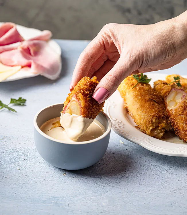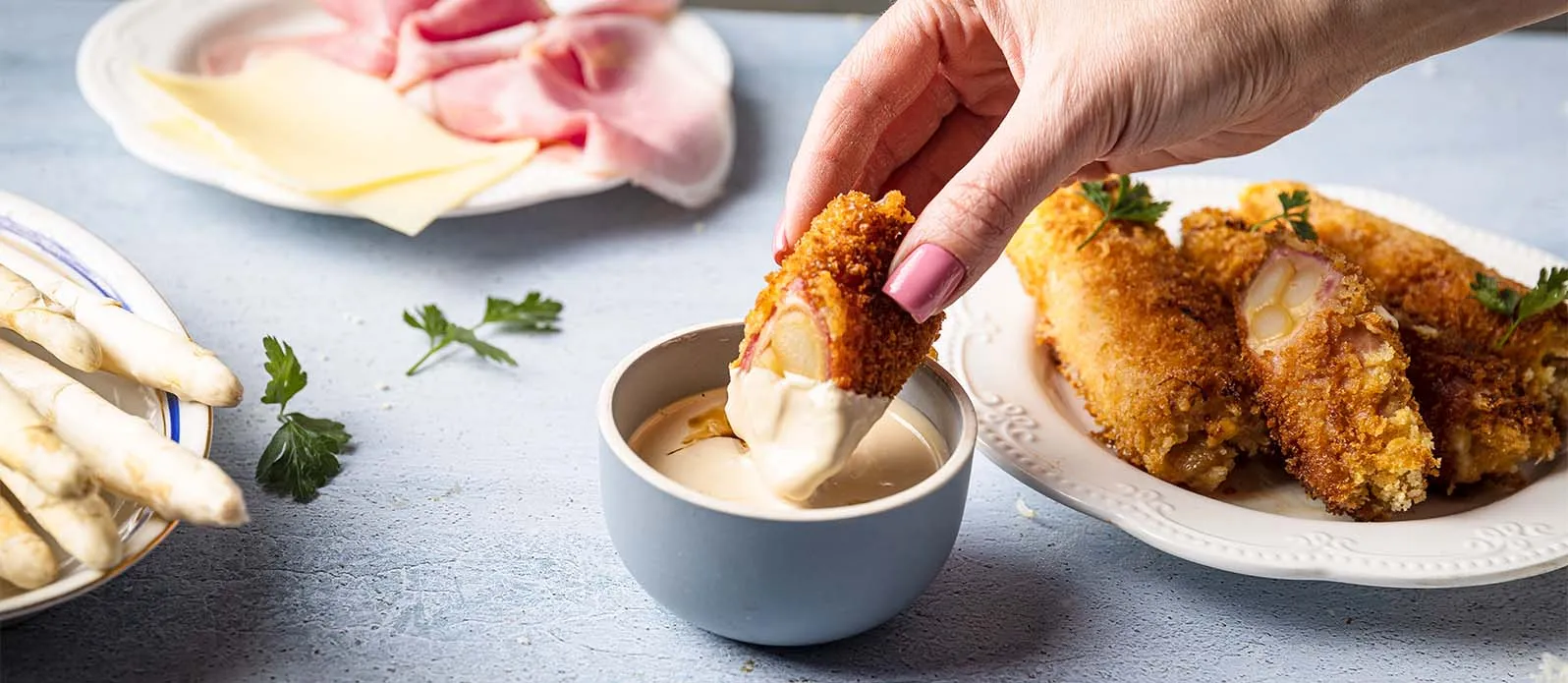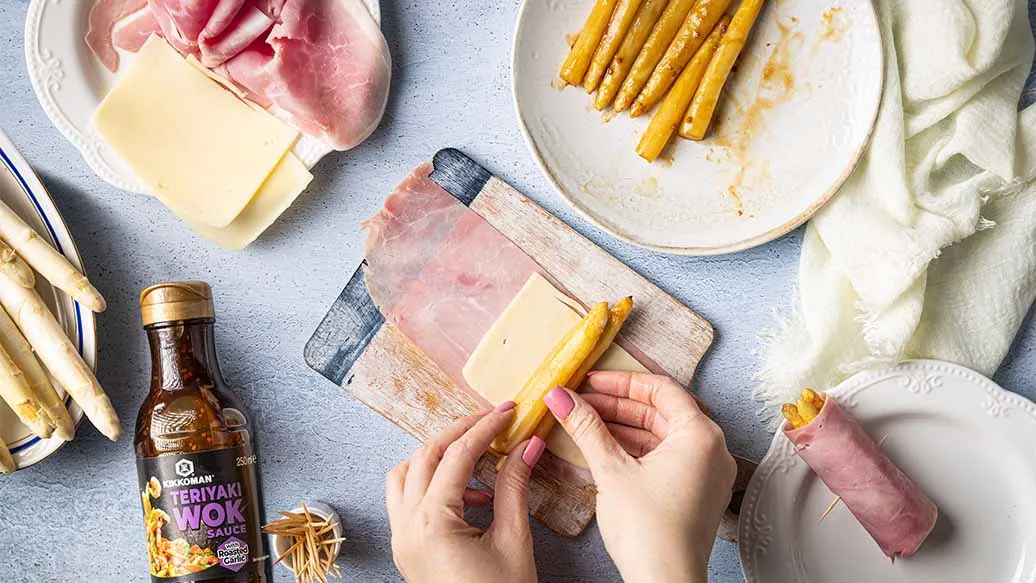 Een lentevariant op cordon bleu. Witte asperges gemarineerd in Kikkoman Teriyaki Woksaus met Geroosterde Knoflook, omwikkeld met ham en kaas, vervolgens bedekt met Kikkoman Panko en knapperig afgebakken. Geserveerd met een snelle dip van Kikkoman Ponzu Citroen en mayo.