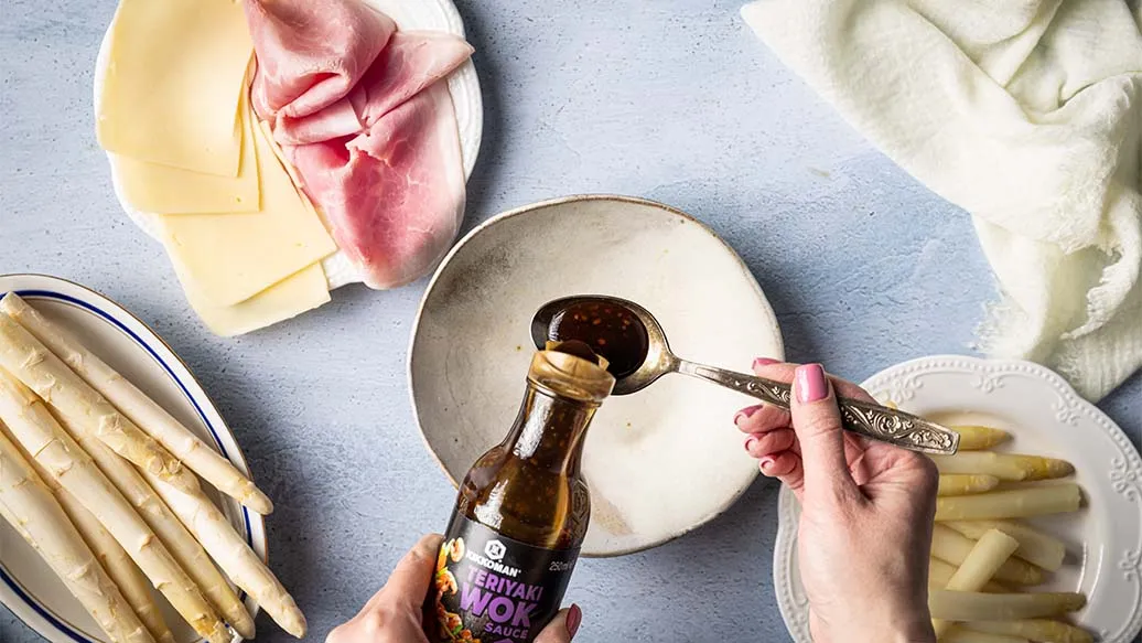 400 g witte asperges – 750 ml water – ½ tl zout – 2 el Kikkoman Teriyaki Woksaus met Geroosterde Knoflook