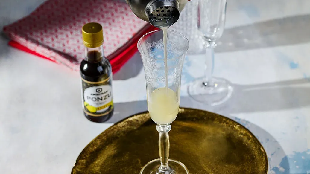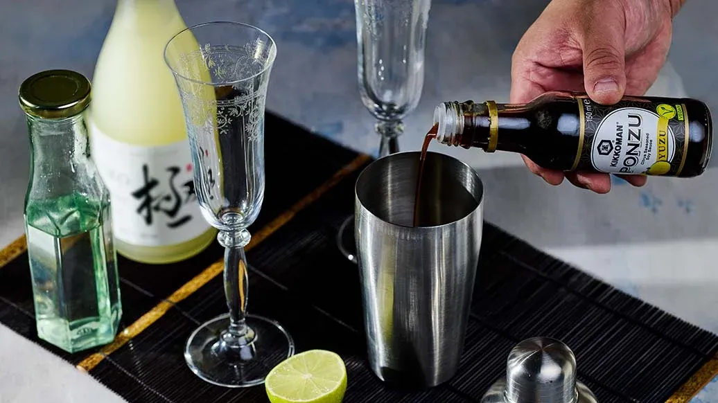 2 cocktailshakers – 16 ijsblokjes (circa 20 g per blokje) – 100 ml yuzu sake – 60 ml limoensap – 40 ml suikersiroop – 2 scheutjes Kikkoman Ponzu - een Mengsel van Sojasaus, Azijn en Yuzusap