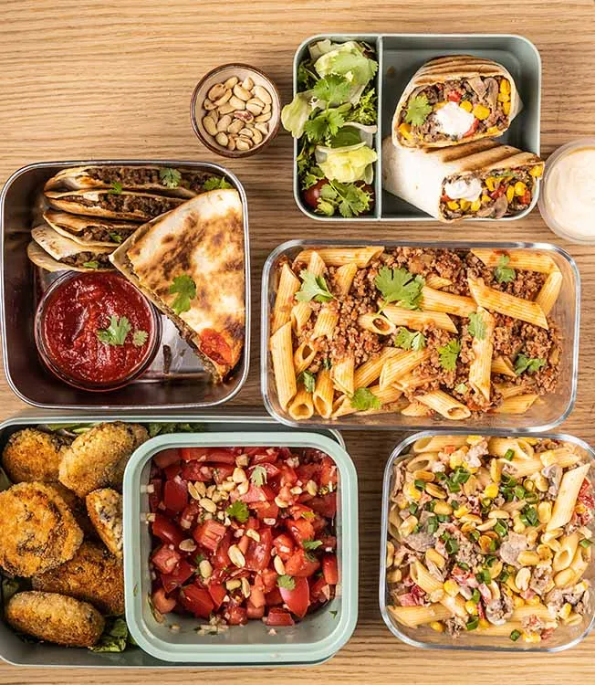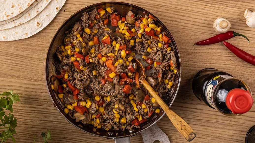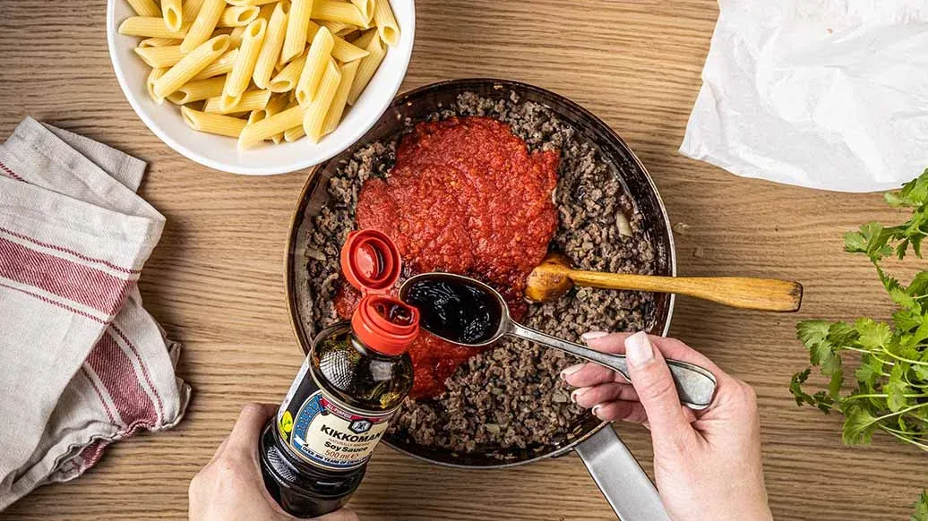 Rundergehakt, champignons, uien en tomaten vormen de basis voor vijf gevarieerde gerechten. Eén keer in een batch koken en vervolgens serveren met pasta, gierst of tortilla's – allemaal samengebracht door een tomatensaus verrijkt met Kikkoman Sojasaus.