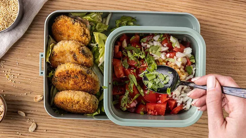 De salade smaakt nog lekkerder na een paar uur in de koelkast – ideaal voor in de lunchbox. Je kunt rucola of een gemengde salademix toevoegen voor een frisse touch.
