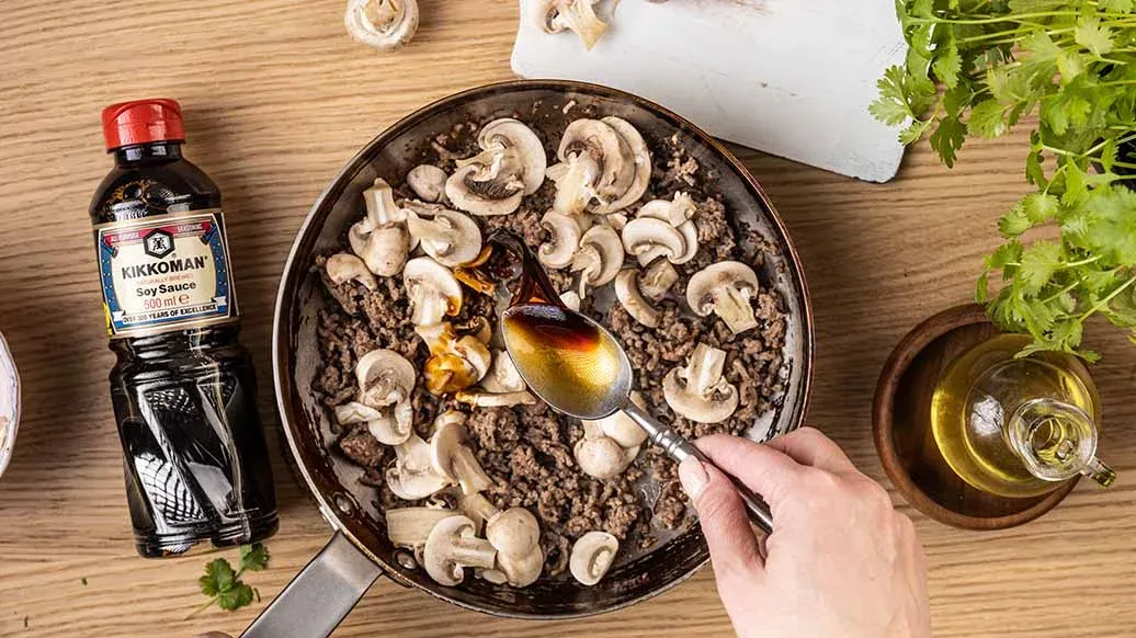 1 el plantaardige olie – 200 g rundergehakt – 100 g champignons, in plakjes gesneden – 1 el Kikkoman Natuurlijk Gebrouwen Sojasaus