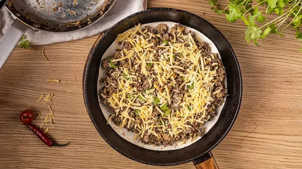 De pittige tomatensaus kan van tevoren worden bereid en werkt ook goed met de andere gerechten in deze set. Eenmaal gebakken kan de gevulde tortilla in driehoekjes worden gesneden en worden geserveerd als warme snack of fingerfood.