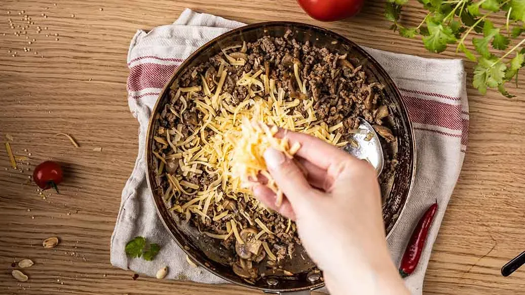 1 el plantaardige olie – 0,5 ui, gesnipperd – 100 g champignons – 150 g rundergehakt – 1 el Kikkoman Natuurlijk Gebrouwen Sojasaus – 2 g gehakte koriander – 50 g geraspte kaas (bijv. Cheddar)
