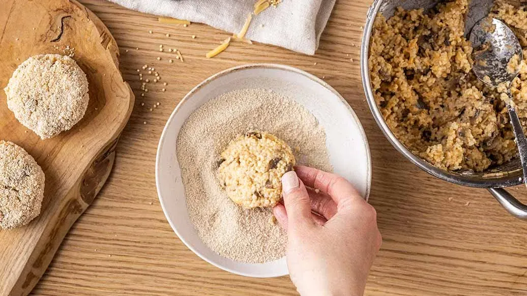 Combineer de gebakken champignons en uien met de gierst als deze afgekoeld is. Voeg de geraspte kaas, het ei, de Kikkoman Sojasaus en de bloem toe. Meng grondig en vorm er burgers van (bijvoorbeeld 6-8 kleine burgers). Bestrijk ze met paneermeel en bak ze in de olie in 3-4 minuten aan elke kant goudbruin.