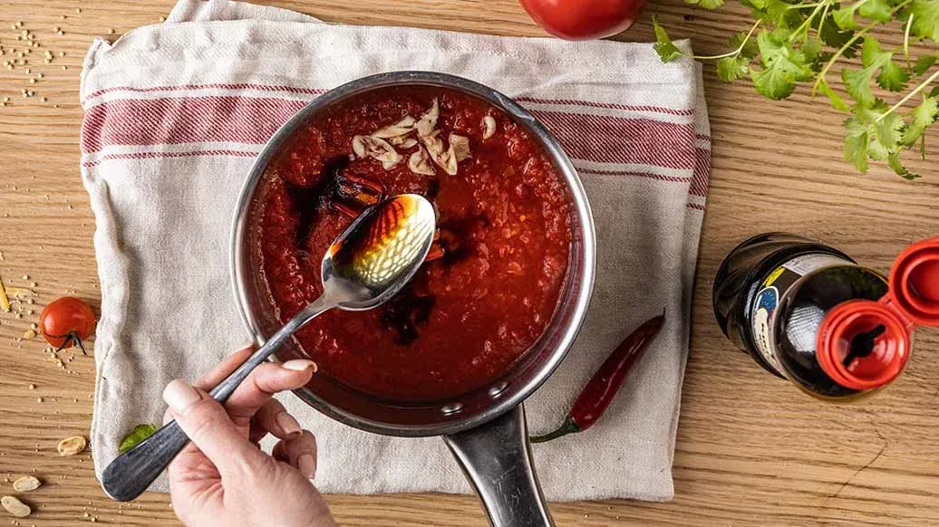 200 g gehakte tomaten uit blik – 1 knoflookteen, fijngehakt – 0,5 rode chilipeper, fijngehakt – 1 el Kikkoman Natuurlijk Gebrouwen Sojasaus – 3 el suiker – 3 el rijstazijn