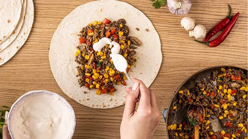 Je kunt burrito's in folie wikkelen om mee te nemen. Voeg voor een scherpere smaak extra rode chilipeper of een beetje srirachasaus toe aan het vlees.