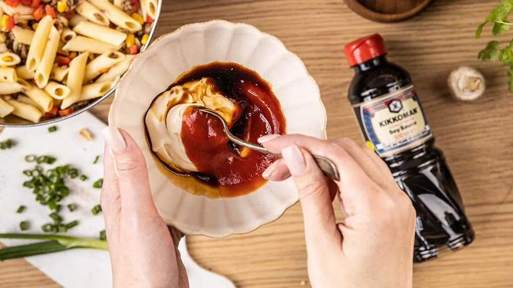 1 el mayonaise – 1 el ketchup – 1 tl Kikkoman Natuurlijk Gebrouwen Sojasaus – 2 el geroosterde pinda's – 1 el lente‑ui, fijngesneden