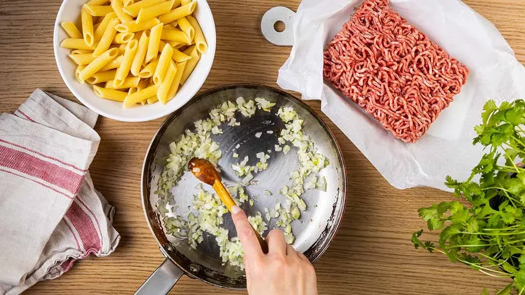 200 g penne pasta – 1 el plantaardige olie – 0,5 ui, gesnipperd – 2 teentjes knoflook, fijngehakt – 300 g rundergehakt