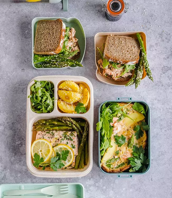 4 eieren – 1 el Kikkoman Natuurlijk Gebrouwen Sojasaus Met Minder Zout – 1 tl peper – 60 g gekookte aardappelen – 0,25 bos(je) groene asperges – 150 g gebakken zalm