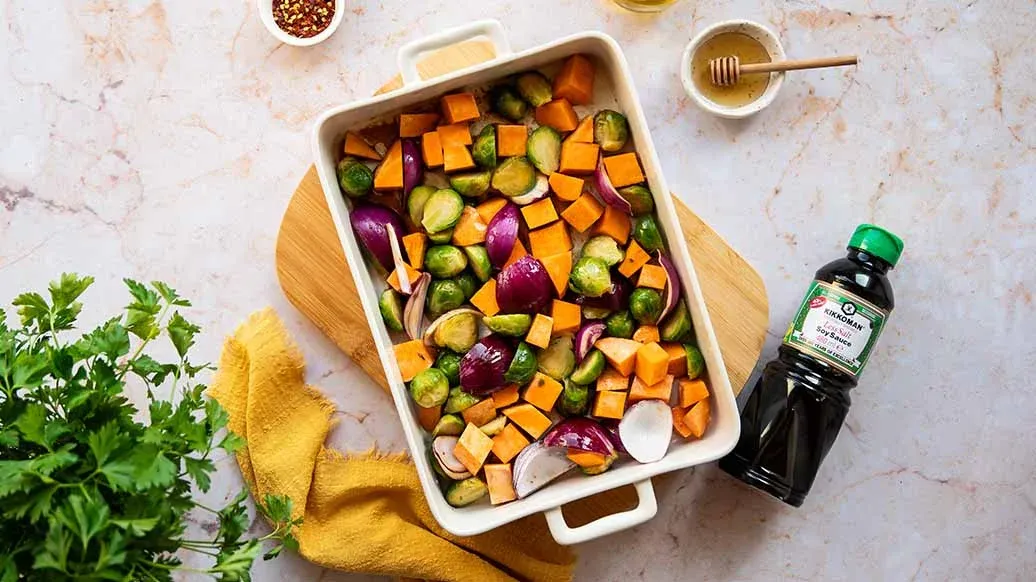 350 g zoete aardappelen – 300 g spruitjes, geblancheerd – 70 g rode ui – 3 el olijfolie – 2 el Kikkoman Natuurlijk Gebrouwen Sojasaus Met Minder Zout – 2 tl honing