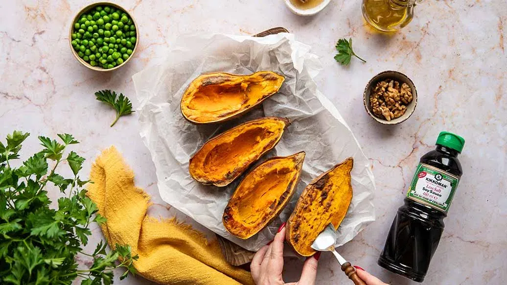 Meng de Griekse yoghurt met de Kikkoman Sojasaus Minder Zout, honing, gehakte noten en peterselie. Roer goed door. Sprenkel de saus voor het serveren over de zoete aardappelen.