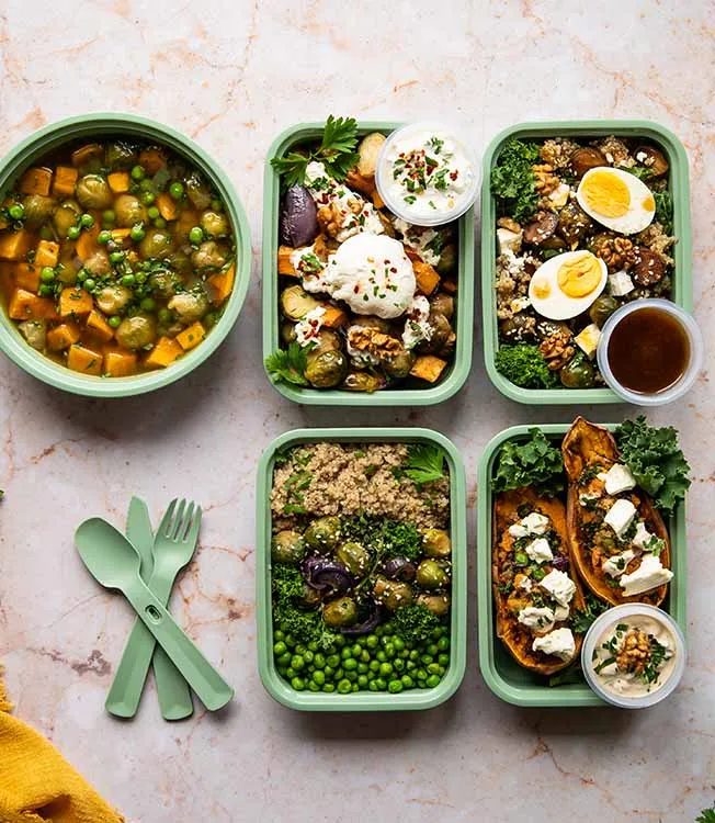 Kook de eieren 7 minuten tot ze hardgekookt zijn. Verwijder de taaie stelen van de boerenkool en hak deze in kleinere stukjes. Doe de quinoa in lunchboxen en voeg dan de spruitjes, boerenkool, gehalveerde eieren en feta toe.