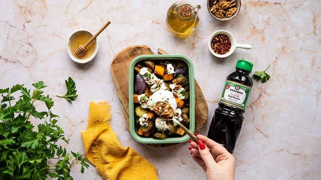Snijd de zoete aardappelen in blokjes, halveer de spruitjes en snijd de ui in vieren. Schep de groenten om met de olijfolie, Kikkoman Sojasaus Minder Zout en honing en rooster ze 25 minuten op 190°C (boven- en onderwarmte) tot ze gaar zijn.
