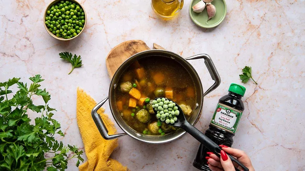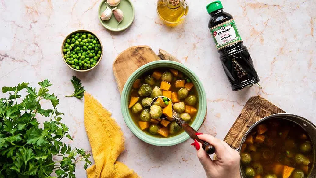 Schil de zoete aardappelen en snijd ze in blokjes. Halveer de spruitjes en snijd de ui fijn. Verhit de olijfolie in een pan en fruit de groenten. Voeg de knoflook, groentebouillon en Kikkoman Sojasaus Minder Zout toe. Laat 8 minuten op laag vuur sudderen, voeg dan de doperwten toe en kook nog 4 minuten.