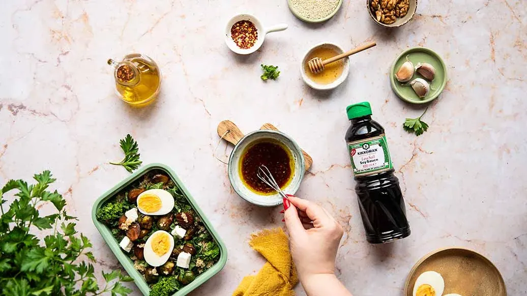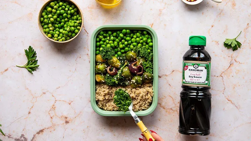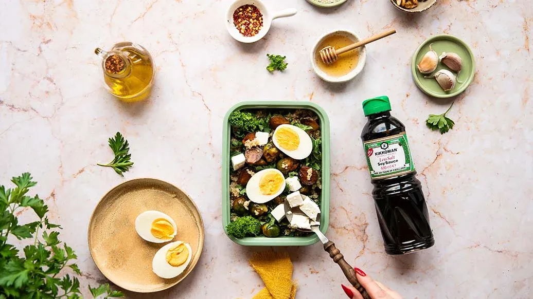 Eenvoudige en gezonde lunches met groenten en quinoa – gemakkelijk te bereiden voor drukke dagen. Kikkoman Sojasaus Minder Zout geeft elk gerecht een hartige touch.
