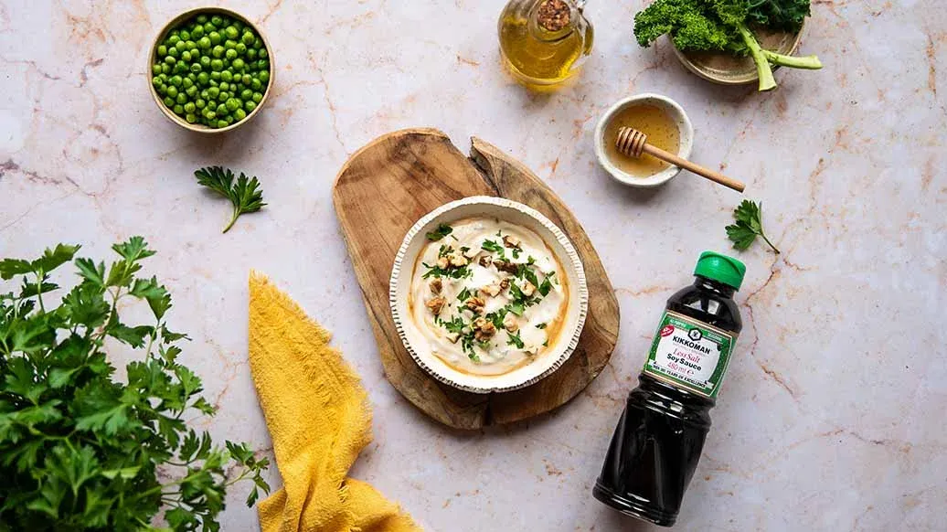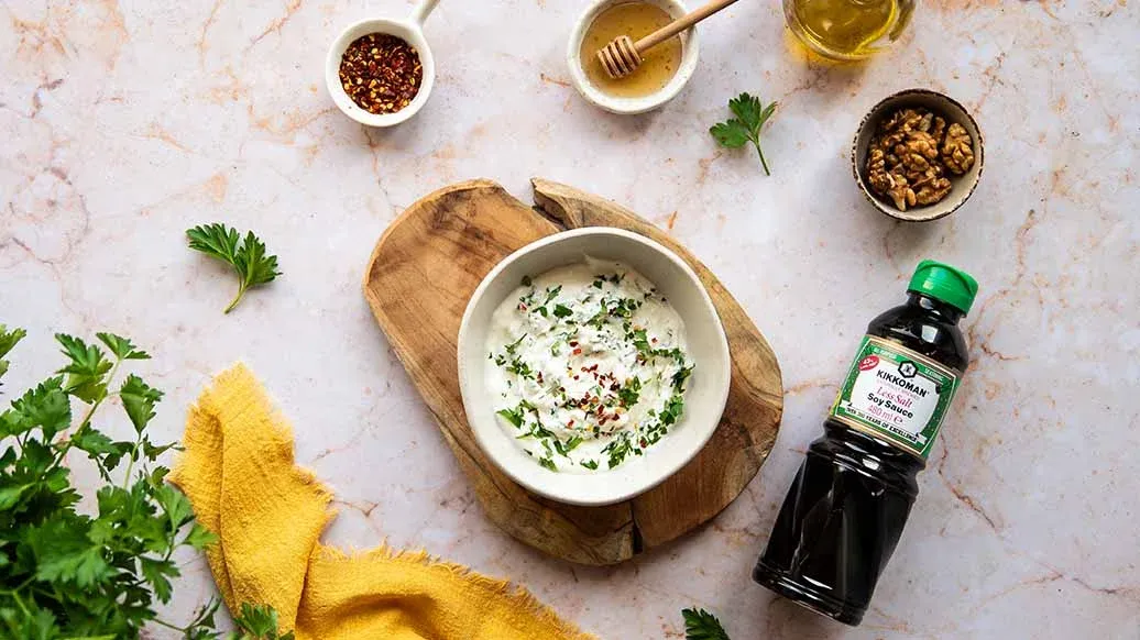 4 el Griekse yoghurt – 1 el Kikkoman Natuurlijk Gebrouwen Sojasaus Met Minder Zout – 2 tl honing – 15 g gehakte walnoten – 0,5 el gehakte peterselie